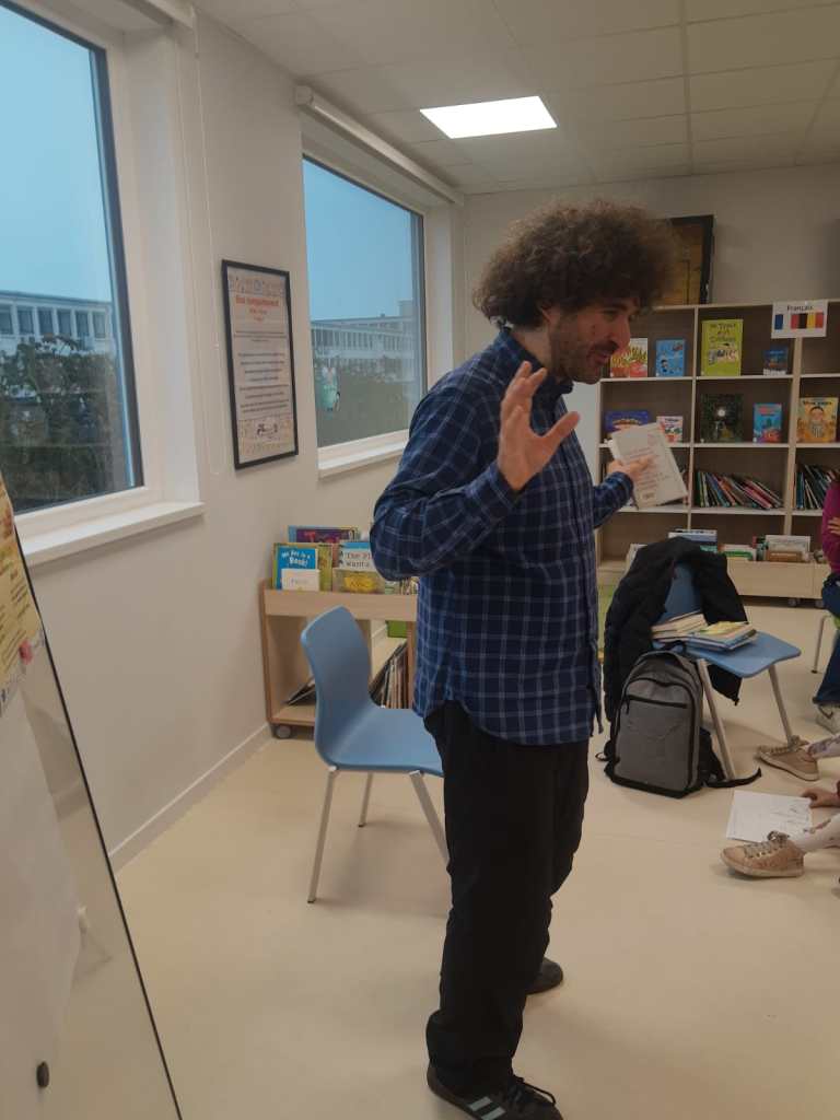 Protagonisti dei primi incontri, giovedì e venerdì mattina, sono stati 170 bambini di 13 classi di primaria della sezione italiana di alcune scuole europee. I bambini hanno incontrato Michele D’Ignazio e questo incontro ha generato tantissimo entusiasmo tra i giovani lettori: regali, autografi e domande di ogni genere hanno tenuto occupato il nostro ospite che, con grande sensibilità, ha saputo ascoltare e accontentare tutte le richieste. I più piccolini si sono raccontati attraverso le pagine di Storia di una matita, i più grandi invece erano soprattutto curiosi di vedere uno scrittore in carne e ossa e la gentilezza di Michele ha fatto il resto.