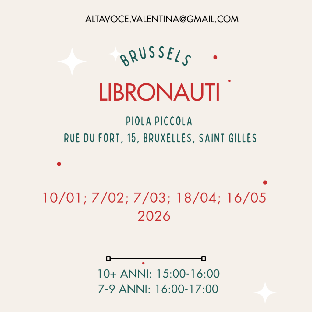 In questo sito troverete informazioni sulle attività nostre e di librerie, centri culturali e altro a Bruxelles e in Belgio, curiosità e anticipazioni, ma anche consigli di lettura, curiosità e informazioni sulla lettura per i bambini italofoni che non vivono in Italia.