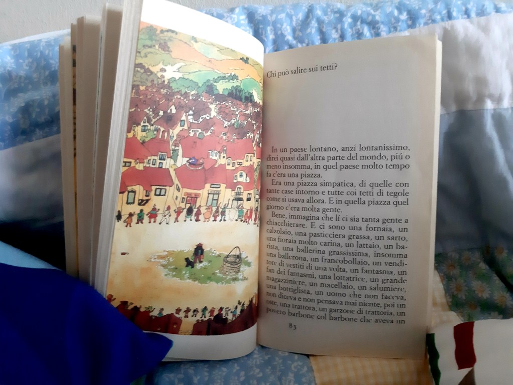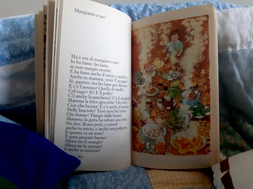 Nonostante il testo sia indicato nel retro di copertina come libro dai 4 anni in su, i testi non sono semplicissimi; adatte a quell’età sono forse alcune poesie. Le tre storie in prosa invece, godibili dai 5 anni circa (sono lunghette e con poche immagini) cattureranno l’attenzione dei bimbi grazie alla loro prosa semplice ma dal lessico molto ricco e preciso, una vera valanga di parole molto preziosa per noi italiani all’estero: