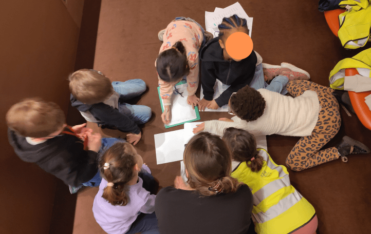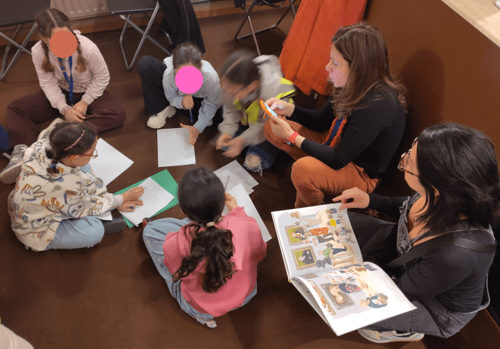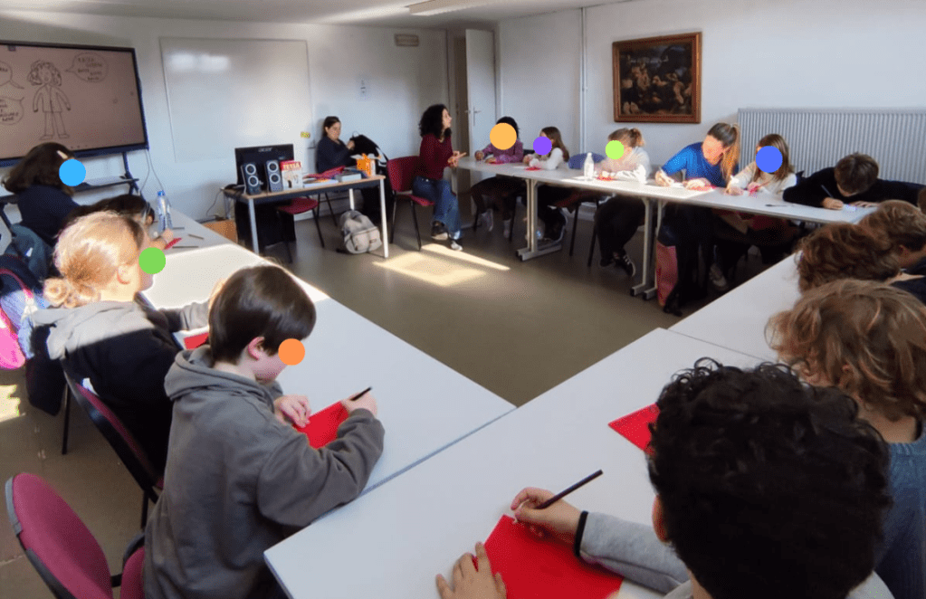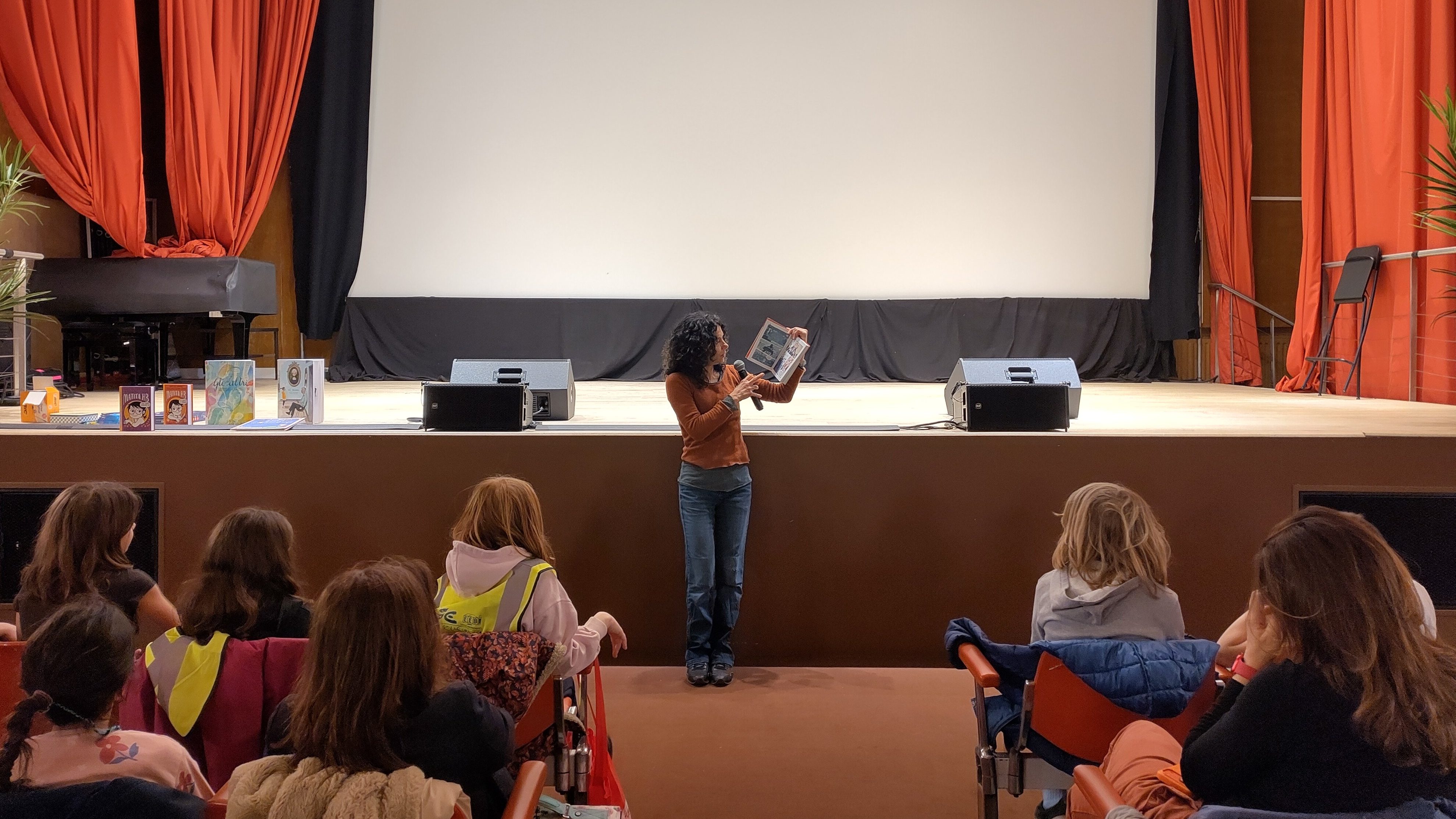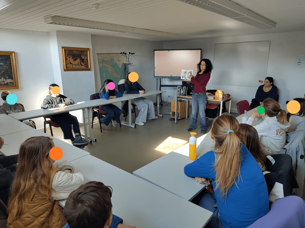 Venerdì una settantina di bambini di primaria della sezione italiana di alcune scuole europee sono andati all’Istituto Italiano di Cultura e, nel teatro dell’IIC, hanno avuto la fortuna di incontrare Susanna Mattiangeli, una scrittrice di libri per bambini molto nota in Italia: ha vinto nel 2018 il Premio Andersen come miglior scrittrice, pubblica con importanti case editrici come Mondadori o Il Castoro e collabora regolarmente con la rivista Internazionale Kids. Ha scritto albi illustrati, come Gli altri (Topipittori), Come funziona la maestra (Editrice Il Castoro), In spiaggia (Topipittori), romanzi come la fortunata serie Matita HB (Editrice il Castoro), fumetti come Aldo&Rosa (Mondadori) o Tessa presidente (Editrice il Castoro). Ha pubblicato anche libri di divulgazione : nel 2024 è uscito La costituzione nelle parole (ed. Lapis) che ha ricevuto la Menzione speciale Premio Un Libro per l’Ambiente 2024-2025, e si è classificato primo al Premio Nazionale di Divulgazione Scientifica – sezione ragazzi.