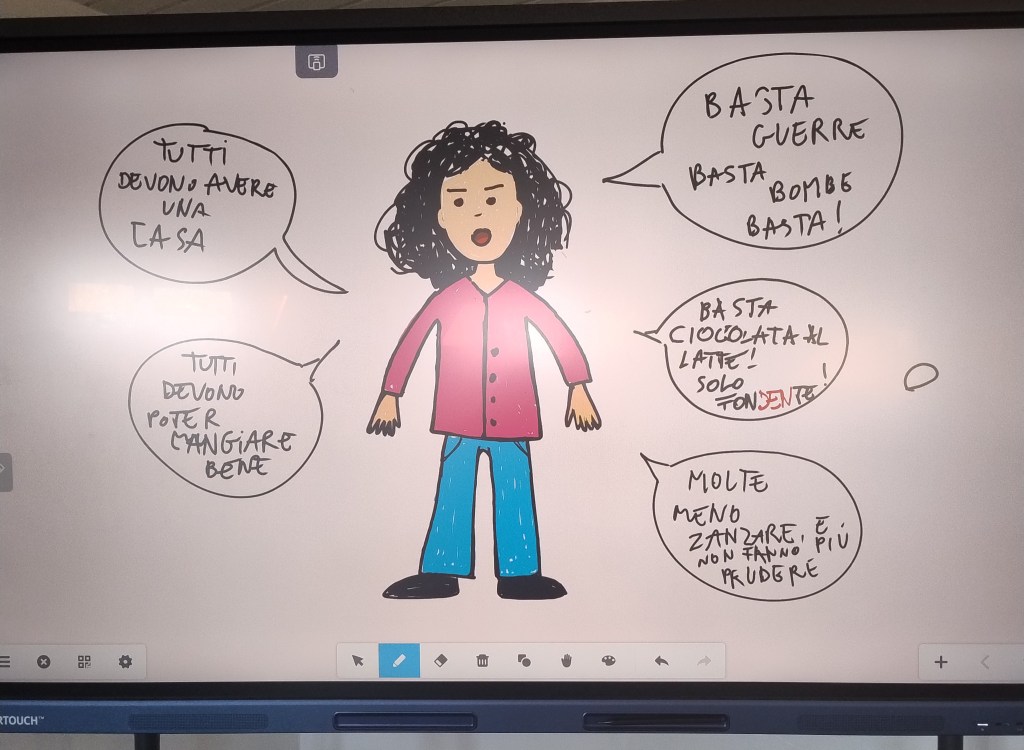 Affianco e in contemporanea, in un’altra aula dell’IIC, una trentina di bambini dagli 8 anni in su hanno incontrato, sempre in due gruppi, Susanna Mattiangeli; hanno dialogato con l’autrice a partire dal suo libro Tessa presidente e immaginato di fare delle proposte concrete su temi che stanno loro particolarmente a cuore per sé stessi e per il mondo (come “caramelle per tutti” 😉), scrivendole in un quaderno che hanno portato a casa.