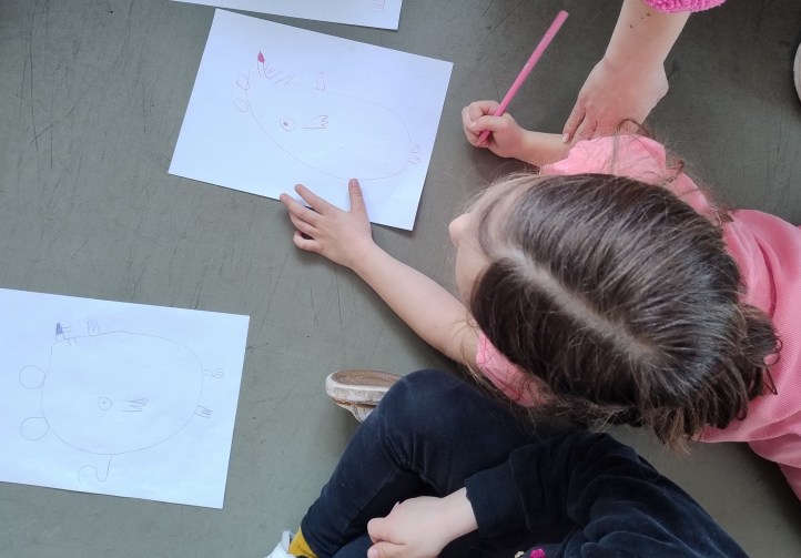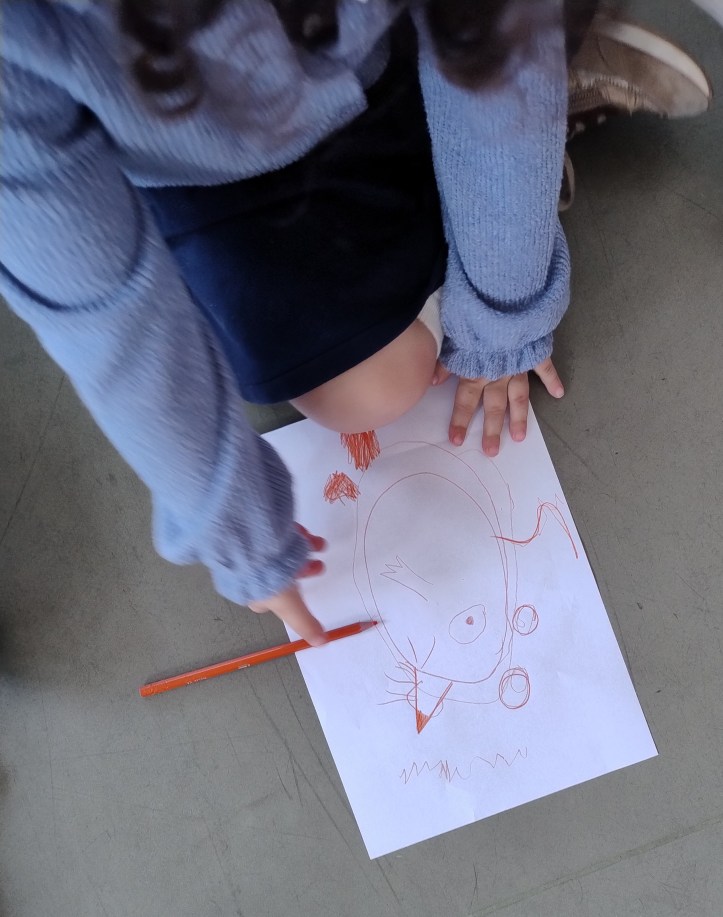 I bambini hanno ascoltato le sue storie e fatto tanti giochi creativi usando il vocabolario degli animali, dei numeri e hanno creato dei personaggi partendo dalla geniale idea di disegnare a segmenti, associando le parti del corpo al cibo (baffi come spaghetti spezzati, occhio come nocciolo di una ciliegia, ecc…); Alessandro ha poi portato i bambini a fare attività sul corpo e sulle azioni partendo dalla storia narrata, introducendo oggetti ironici e inattesi da fare commentare ai bambini; giochi e attività che li hanno tenuti attenti e a bocca aperta (per stupore e risate) fino all’ ultimo secondo.