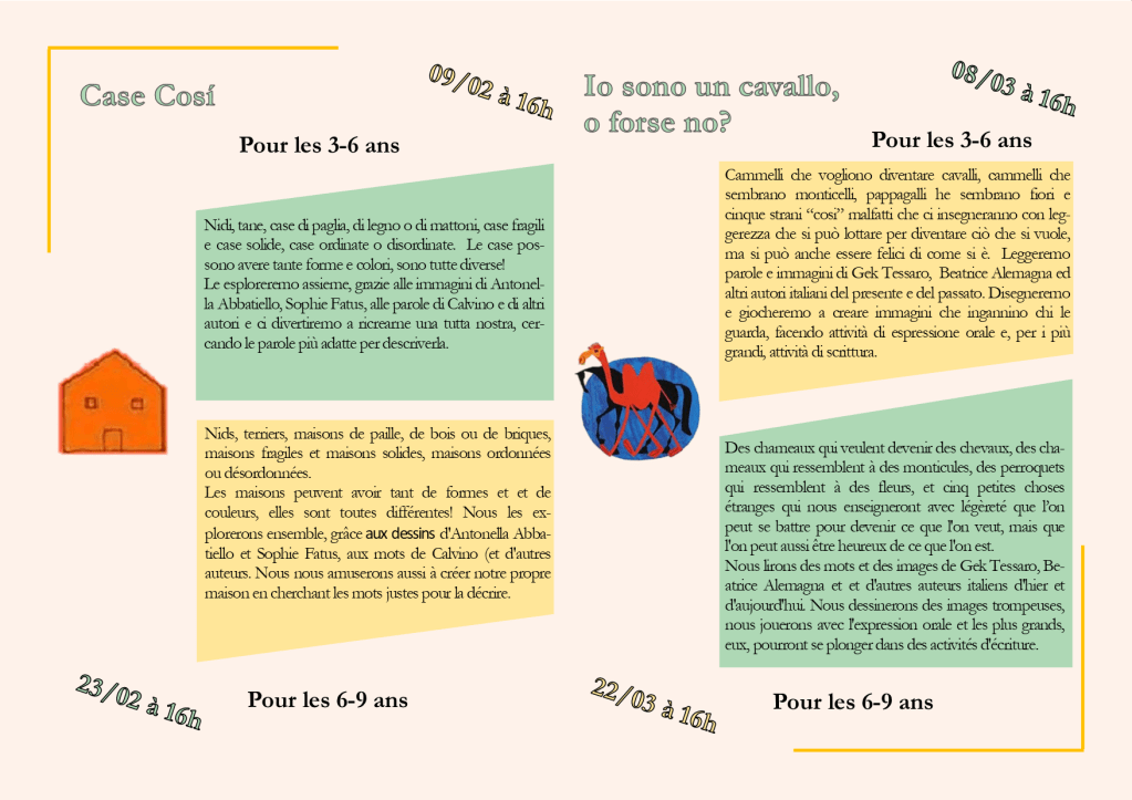 A ottobre abbiamo ripreso le nostre attività dal vivo, al VI45, a Saint Gilles! Concluderemo questo mese gli appuntamenti finanziati dal comune di Saint Gilles nell’ambito del progetto « Égalité des Chances et des Droits des Femmes », inaugureremo le letture 1-3 anni, le letture/ laboratori di italiano di Irene e quelle online di Alessandra. Tantissime novità che trovate illustrate qua, assieme alle modalità di iscrizione.
