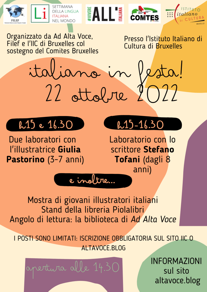 Torna l’autunno e tornano i laboratori per i piccoli sotto i tre anni e le letture animate per i più grandi (per tutte le informazioni puoi leggere la nostra ultima newsletter)! Tornano dopo la lunga pausa estiva in cui siamo state assorbite dall’organizzazione di Italiano in festa!, la bellissima giornata organizzata assieme all’Istituto Italiano di Cultura di Bruxelles, grazie al finanziamento del Comites, che ci ha permesso di portare in Istituto più di 60 bambini con le loro famiglie e di avere una giornata dedicata alla letteratura per l’infanzia (qua sotto trovate le informazioni sull’evento e sugli autori che ci sono venuti a trovare). Vi ringraziamo per la calorosa partecipazione e il sostegno che ci avete dimostrato!