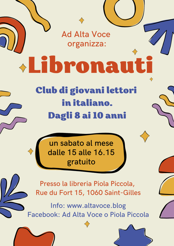 Per quest’anno il club di lettori Libronauti cresce coi lettori e si sdoppia! Gli incontri continueranno infatti alla libreria Piola Piccola di Saint Gilles, ma in due gruppi distinti, 7-9 anni (alle 16) e 10-12 anni (alle 15). Le attività riprenderanno ad ottobre e per iscriversi è sufficiente scrivere a altavoce.valentina@gmail.com. Vi ricordiamo che la partecipazione al club è gratuita!