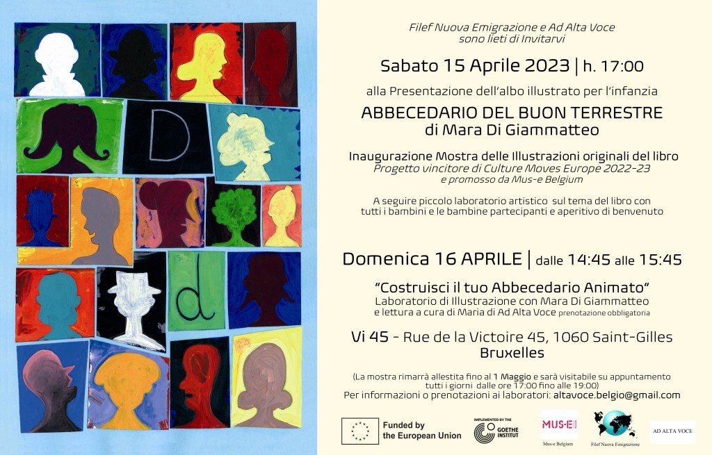 Sabato 15, alle 17 siete invitati, adulti e bambini, all’inaugurazione della mostra delle illustrazioni originali tratte dall’albo illustrato per l’infanzia Abbecedario del buon terrestre dell’artista italiana Mara Di Giammatteo (progettore vincitore di Culture Moves Europe 2022-23 e promosso da Mus-e Belgium). Alle 17 ci sarà la presentazione, da parte dell’artista, del suo albo, cui seguirà un piccolo laboratorio artistico sul tema del libro per bambini dai 4 anni in su. Le attività del 15 sono gratuite e non è necessario iscriversi.
