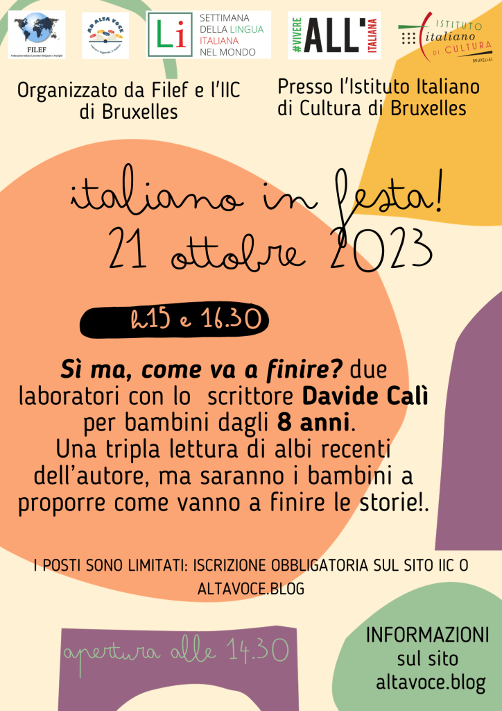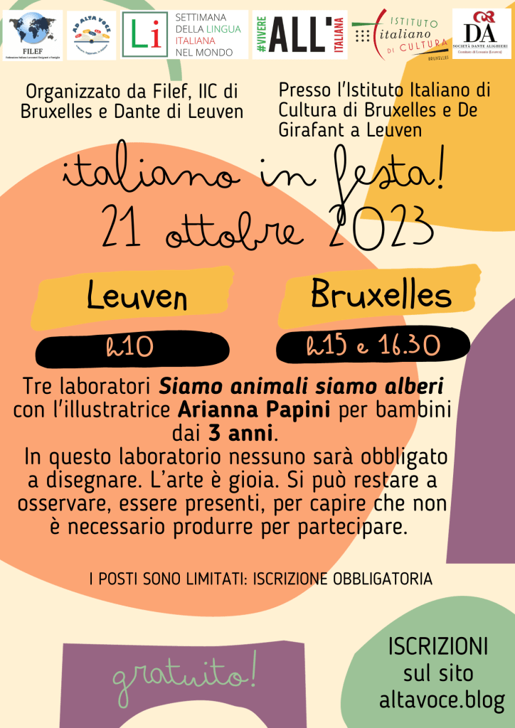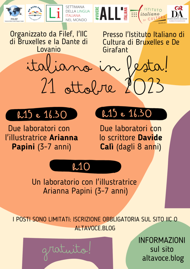 Innanzitutto un caloroso grazie a tutti coloro che, il 21 ottobre 2024, hanno riempito di colori e voci le sale dell’Istituto Italiano di cultura a Bruxelles e il De Girafant a Leuven, in occasione di Italiano in festa!, la giornata di laboratori per bambini con autori italiani che abbiamo organizzato in occasione della Settimana della Lingua Italiana nel mondo, che quest’anno ha portato i bambini a incontrare lo scrittore Davide Calì e l’illustratrice Arianna Papini.